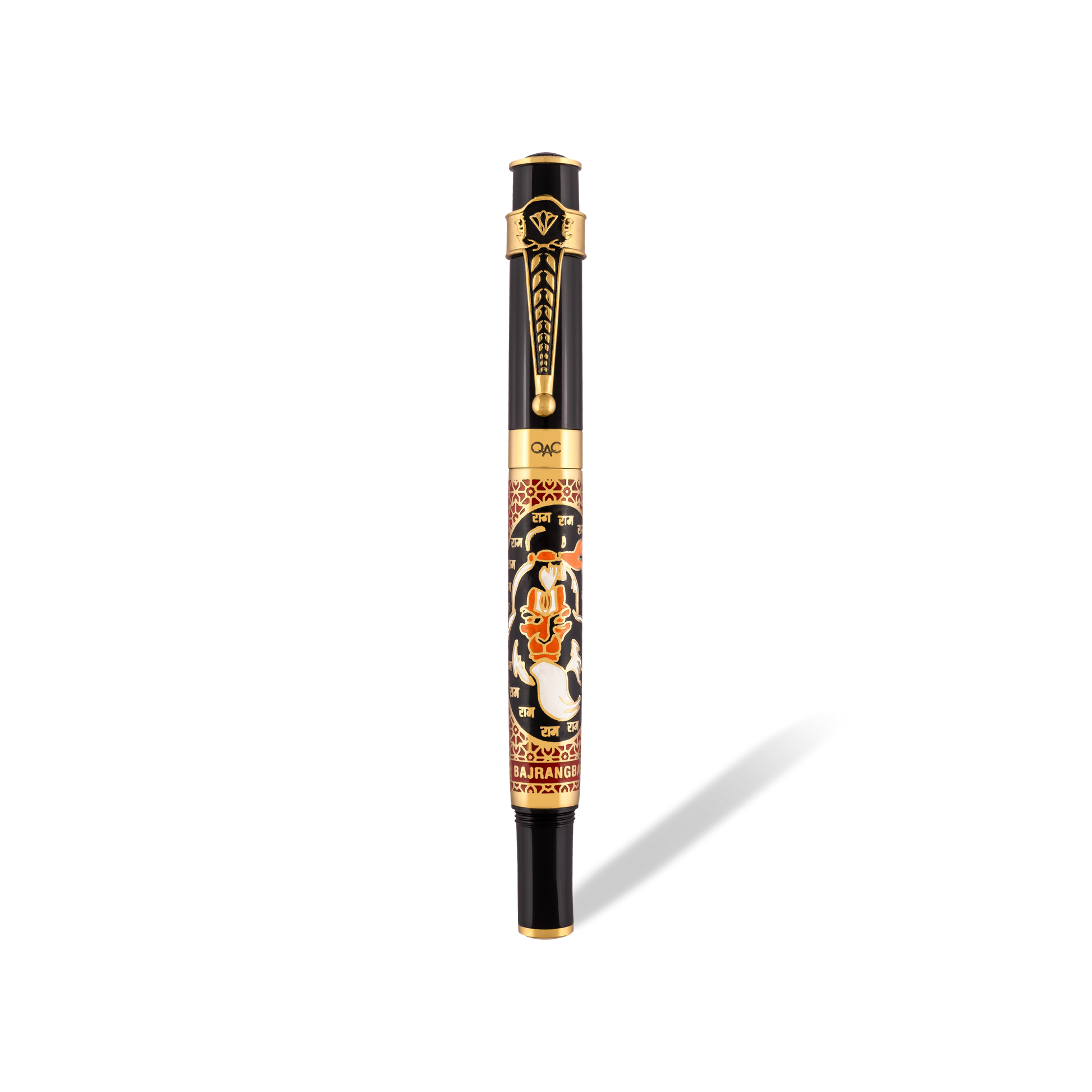 This exquisite FOUNTAIN pen is part of the Sculpture range of AUTOGRAPH pens from OAC. The barrel depicts a hand engraved image of Bajrangee, also known as Hanuman, is revered as a divine vanara, and a devoted companion of the deity Rama.. He is traditionally believed to be an incarnation of Shiva.