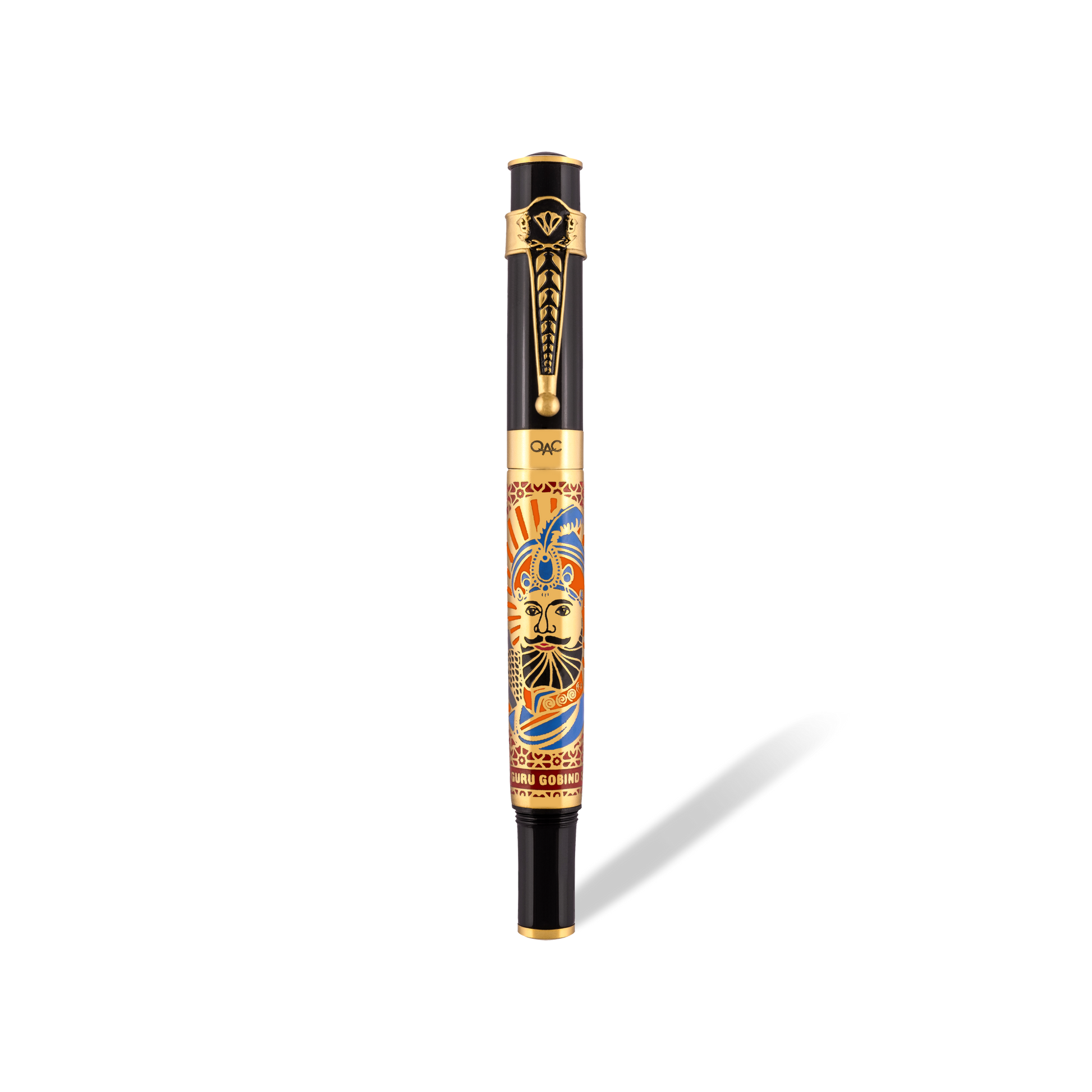 Shree Guru Gobind Singh Ji - This exquisite fountain pen is part of the Sculpture range of Epic pens from Orchid Art & Craft. The barrel depicts a hand engraved image of Shree Guru Gobind Singhji, the tenth and last human Sikh Guru. He was a warrior, poet and philosopher. In 1675, at the age of nine he was formally installed as the leader of the Sikhs. Spiritual Growth and Devotion Social Justice and Equality Courage and Resilience Service to Humanity (Seva) Inspiration for Moral Integrity